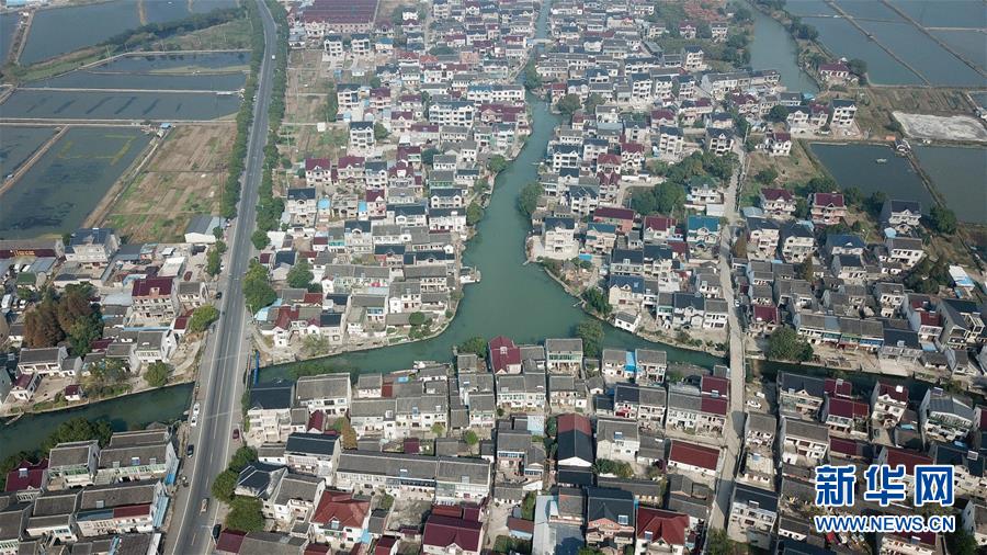 開(kāi)弦弓村村貌(10月23日無(wú)人機(jī)拍攝)。小清河穿村而過(guò),從高空俯瞰,南村河道像張弓,北村河道像支箭,村名由此而來(lái)。 新華社記者 季春鵬攝
