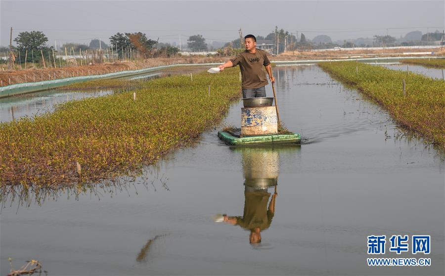“70后”村民李錦和在自家蟹塘里給螃蟹苗喂食(10月24日攝)。李錦和在開(kāi)弦弓村經(jīng)營(yíng)著近50畝蟹塘,專養(yǎng)螃蟹苗,每天從早上5點(diǎn)就開(kāi)始忙碌,到了10月份蟹苗上市的季節(jié)就更加忙碌了,幾乎日夜守護(hù)在蟹塘邊。開(kāi)弦弓村90%的水域用于水產(chǎn)養(yǎng)殖,以蝦蟹為主。 新華社記者 季春鵬攝