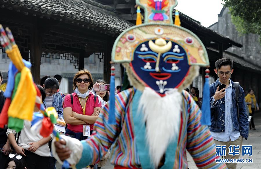 頭戴“藍(lán)”面具、身著五彩裝……附耳在一鼓一鈸中,且看這18名雪域農(nóng)牧民,在這江南水鄉(xiāng)的柔情中吟唱而舞。10月23日至28日,浙江烏鎮(zhèn)西柵景區(qū)的安渡坊碼頭廣場上,珠峰藏戲《頓月頓珠》吸引眾多游客駐足。參與演出的迥巴藏戲隊(duì)來自西藏日喀則市昂仁縣,人們在領(lǐng)略到藏戲風(fēng)采的同時(shí),也感受到了雪域農(nóng)牧民的純樸熱情。 藏戲是戴著面具、輔以唱舞敘事的藏族戲劇。內(nèi)容取材自民間故事、歷史傳說等,距今已有600多年歷史,被譽(yù)為“西藏文化的活化石”。2006年被列入國家級非物質(zhì)文化遺產(chǎn),2009年被聯(lián)合國教科文組織認(rèn)定為世界級非物質(zhì)文化遺產(chǎn)。