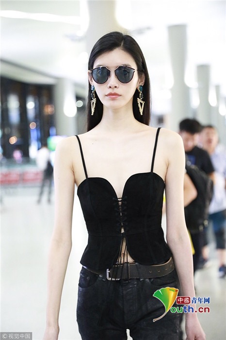 2018年7月25日,上海,奚夢瑤現(xiàn)身機(jī)場,她穿吊帶馬甲配過膝長靴,頻撩發(fā)似女特工。