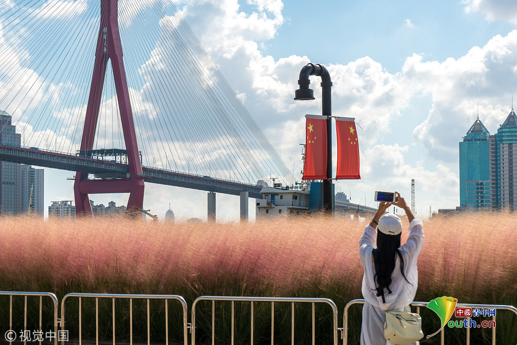 2018年9月28日,上海,東外灘楊浦濱江的粉黛亂子草目前已進(jìn)入盛花期,當(dāng)日早間,不少市民來到濱江拍照賞景,成片的紫色花海在藍(lán)天白云映襯下美不勝收。圖片作者:王岡/視覺中國