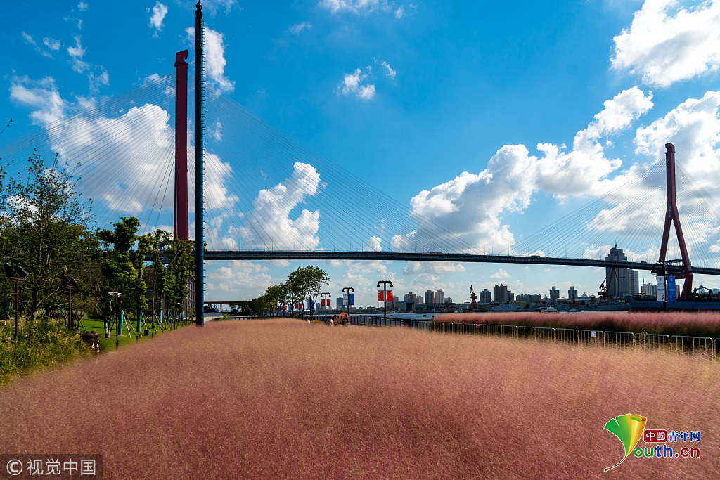 2018年9月28日,上海,東外灘楊浦濱江的粉黛亂子草目前已進(jìn)入盛花期,當(dāng)日早間,不少市民來到濱江拍照賞景,成片的紫色花海在藍(lán)天白云映襯下美不勝收。圖片作者:王岡/視覺中國