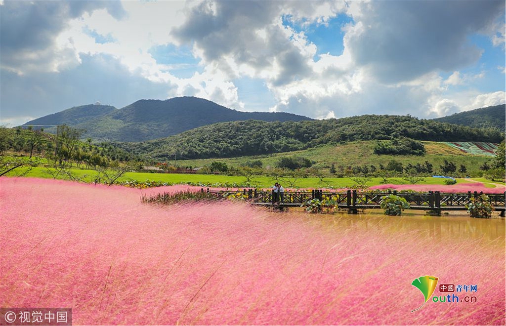 當游客來到這里,立刻被眼前的一片浪漫的粉色所吸引。只見半人高的粉黛亂子草,縹緲如輕煙,搖曳似夢幻,伴著微風(fēng)掀起了一陣陣的波浪。