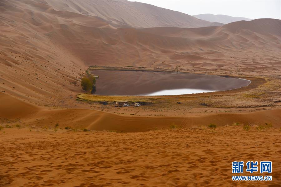 陰雨中的沙漠湖泊,常常讓人以為是一面鏡子(10月18日攝)。巴丹吉林沙漠位于內(nèi)蒙古西部阿拉善盟,是中國(guó)第三大沙漠,沙丘起伏的曲線陡變成高聳的沙山,碧藍(lán)的湖泊散落在沙海間。新華社記者李仁虎攝