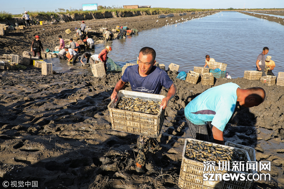 深圳新聞網訊 2018年9月8日,遼寧丹東,早上5點,挖蟶人紛紛下到各個池子,要在海水海泥里艱辛勞作10小時,直至下午3點集體上岸,等待買家的運輸車隊運走他們的勞動成果。9月初,遼寧沿海養(yǎng)殖區(qū)進入養(yǎng)殖海鮮的收獲季。在東港,常常出現(xiàn)數百人乃至上千人集結在池子里挖蟶子(這里特指縊蟶,即東港當地人所說的小人仙。下同)的壯觀景象。在養(yǎng)殖海鮮的收獲季,成群的海鷗趁機“助陣“,人與大自然和諧共處的畫面令人嘆為觀止。