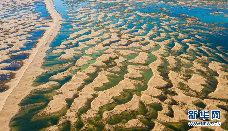 在內(nèi)蒙古鄂爾多斯市杭錦旗境內(nèi)的庫(kù)布其沙漠腹地,由凌汛期的黃河水匯聚而成的濕地在日光照射下顯示出絢麗多彩的顏色(6月9日無人機(jī)拍攝)。