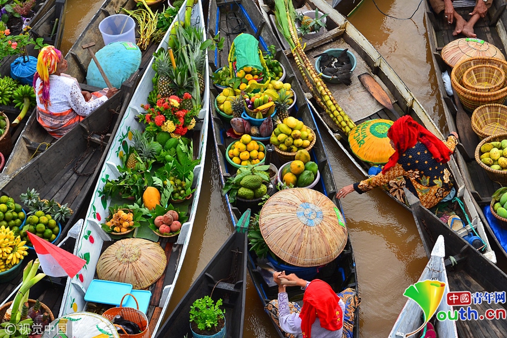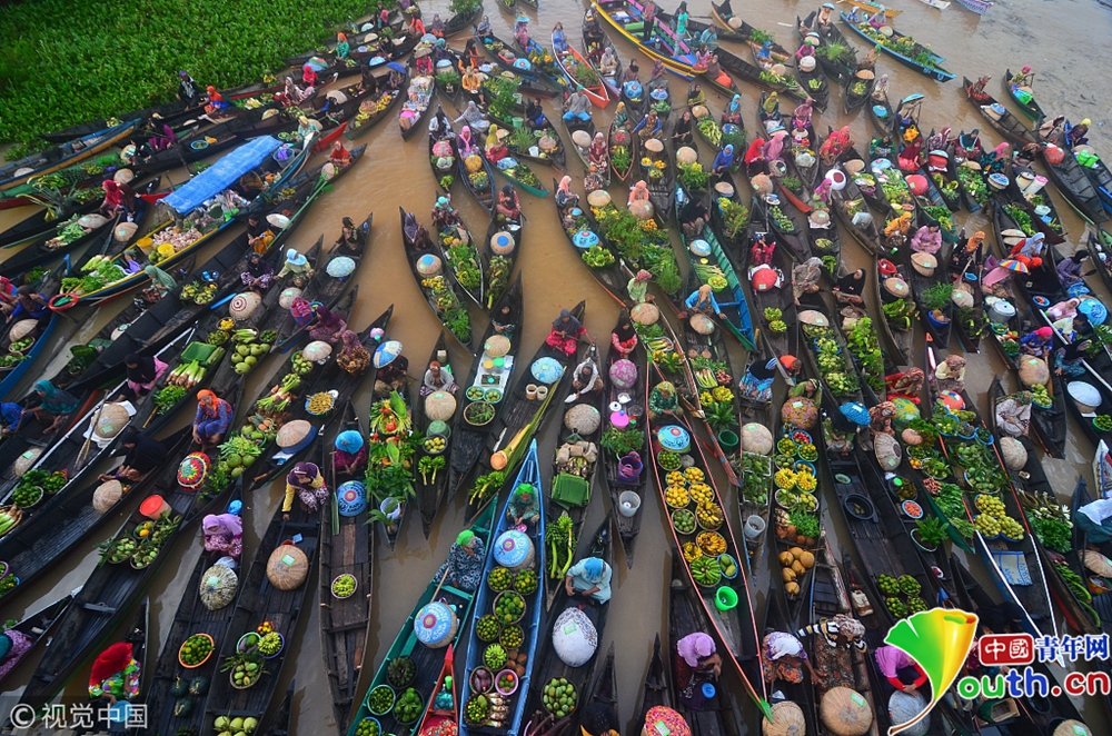 數(shù)以百計(jì)的小販們乘坐小船聚集在水上集市,出售他們親手采摘的新鮮果實(shí)和蔬菜,他們的衣著和貨物融合出令人驚嘆的色彩盛宴。 圖片來(lái)源:視覺(jué)中國(guó)