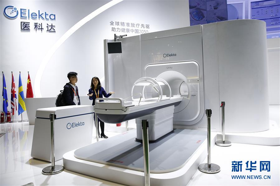 11月6日,瑞典醫(yī)科達(dá)公司工作人員為一名記者介紹高場強(qiáng)磁共振放療系統(tǒng)Elekta Unity。該款診斷級磁共振成像系統(tǒng)與先進(jìn)的放療加速器有機(jī)結(jié)合,可以在腫瘤放療治療的過程中實時、高分辨率地顯示和追蹤腫瘤的變化。 新華社記者 張玉薇 攝