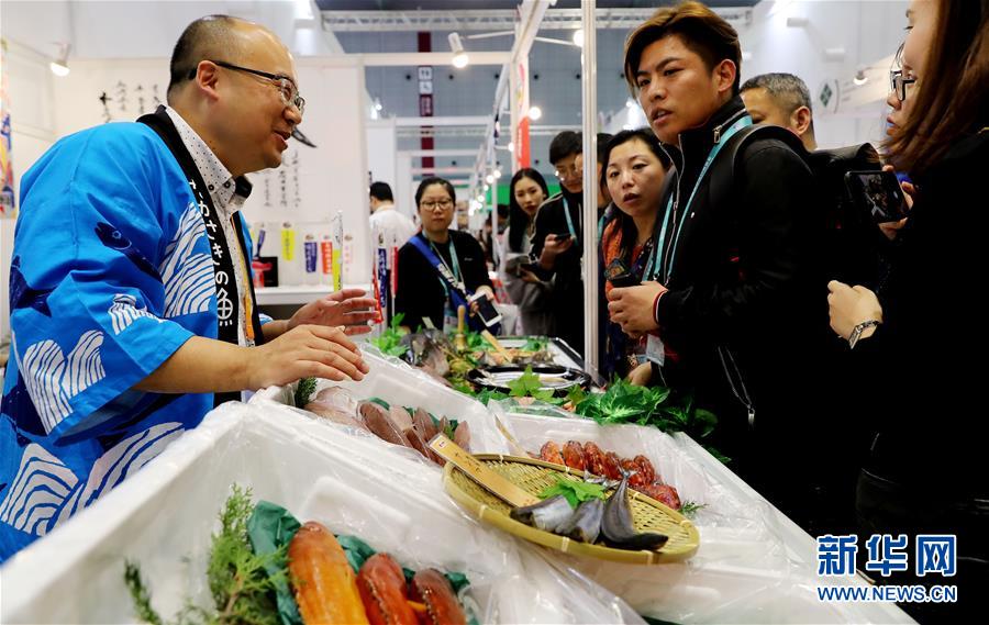 11月6日,工作人員(左)向參觀者介紹由日本新鮮直送的海產(chǎn)品。 新華社記者 方喆 攝