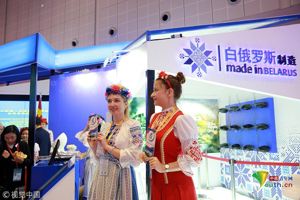2018年11月6日,上海,首屆中國國際進(jìn)口博覽會國家展上,共有82個國家、3個國際組織設(shè)立了71個展臺。白俄羅斯館。視覺中國