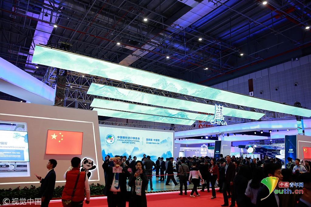 2018年11月6日,上海,首屆中國國際進(jìn)口博覽會國家展上,共有82個國家、3個國際組織設(shè)立了71個展臺。中國館。視覺中國