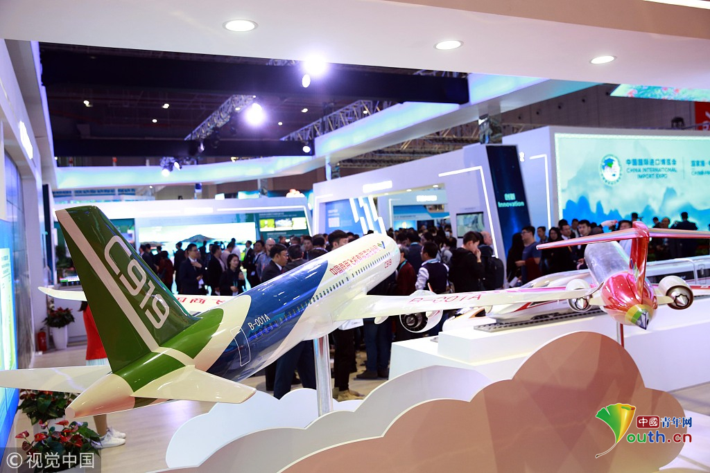 2018年11月6日,上海,首屆中國國際進(jìn)口博覽會國家展上,共有82個國家、3個國際組織設(shè)立了71個展臺。中國館展示的C919飛機(jī)。視覺中國