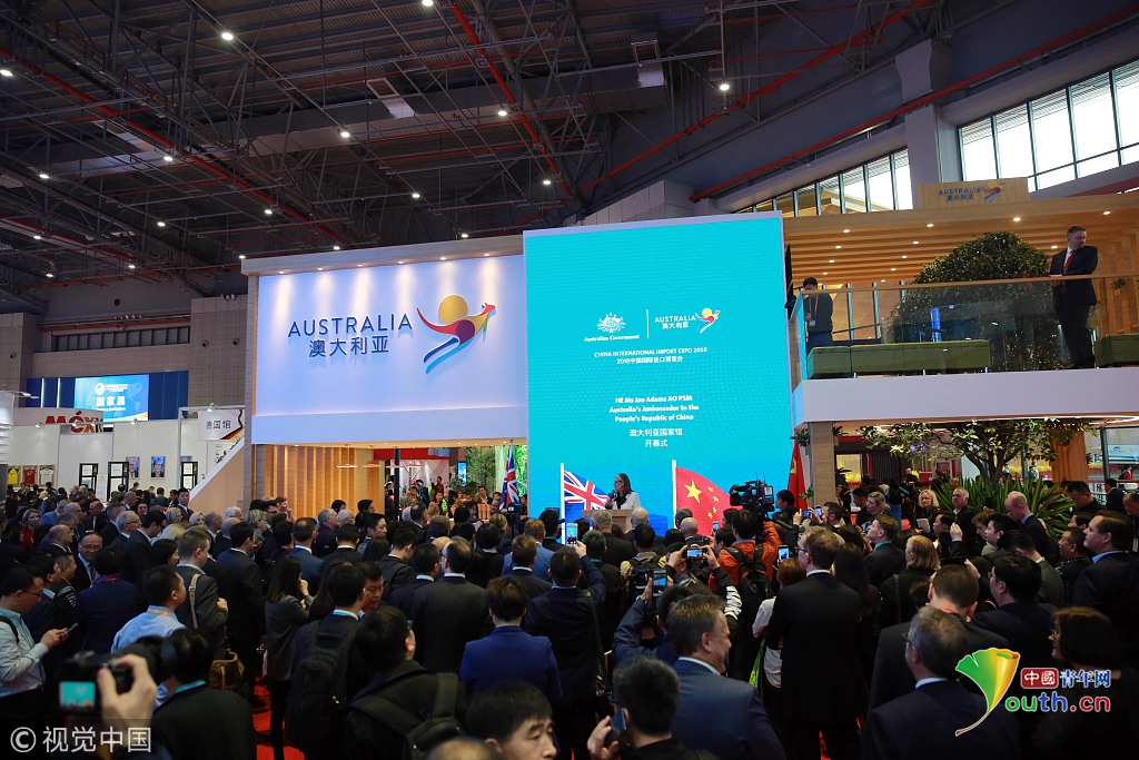 2018年11月6日,上海,首屆中國國際進(jìn)口博覽會國家展上,共有82個國家、3個國際組織設(shè)立了71個展臺。澳大利亞館新產(chǎn)品、新技術(shù)發(fā)布。視覺中國