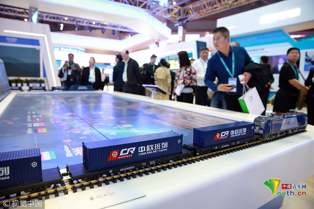 2018年11月6日,上海,首屆中國國際進(jìn)口博覽會國家展上,共有82個國家、3個國際組織設(shè)立了71個展臺。中國館展示的中歐班列。視覺中國