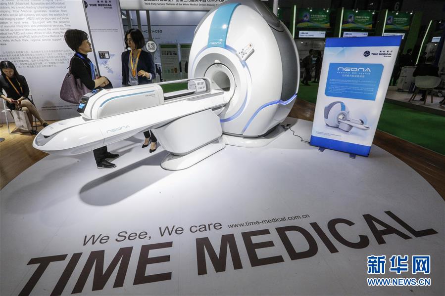11月6日,美時醫(yī)療(美國)有限公司工作人員為參觀者介紹世界首臺嬰幼兒專用核磁共振儀。該設(shè)備填補(bǔ)了這個領(lǐng)域的市場空白,體型輕巧,成像分辨率高,更方便在新生兒重癥監(jiān)護(hù)室里使用。