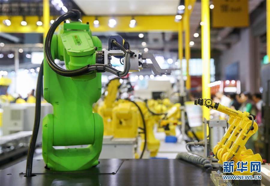 11月6日,日本發(fā)那科公司的協(xié)作機(jī)器人在展臺上展出。 新華社記者 丁汀 攝