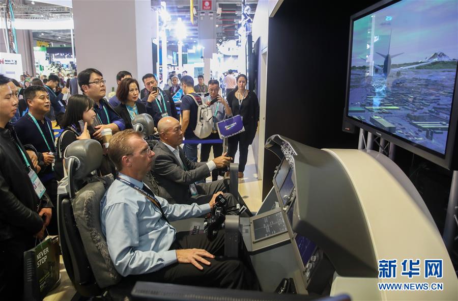 11月6日,參觀者在美國波音公司展臺體驗“駕駛”波音客機(jī)。新華社記者 丁汀 攝