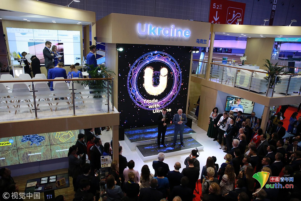 2018年11月6日,上海,首屆中國國際進(jìn)口博覽會國家展上,共有82個國家、3個國際組織設(shè)立了71個展臺。烏克蘭館新產(chǎn)品、新技術(shù)發(fā)布。視覺中國