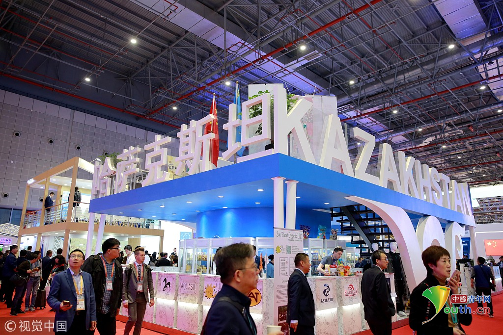 2018年11月6日,上海,首屆中國國際進(jìn)口博覽會國家展上,共有82個國家、3個國際組織設(shè)立了71個展臺。哈薩克斯坦館。視覺中國