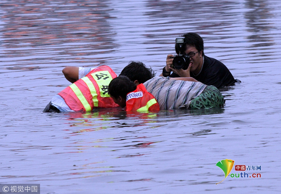 2007年8月6日,北京北三環(huán)安華橋雨后出現(xiàn)積水,這段北京最繁忙的道路之一的路段一度交通中斷,排險(xiǎn)人員緊急趕到現(xiàn)場(chǎng)做出排水等應(yīng)急舉措。圖片作者:王玨茜/視覺(jué)中國(guó)