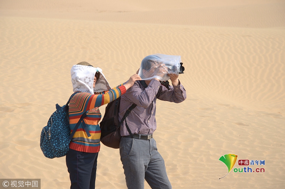 2013年05月05日,河北省張家口市,懷來(lái)天漠景區(qū)里的一名全副武裝的攝影師在風(fēng)中拍攝?!D片作者:蘇衛(wèi)忠/視覺(jué)中國(guó)