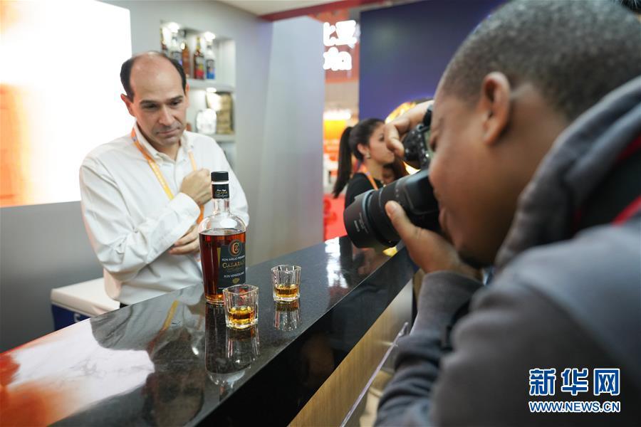 11月7日,在委內(nèi)瑞拉展區(qū),一名參觀者拍攝當(dāng)?shù)厣a(chǎn)的朗姆酒。 中國國際進(jìn)口博覽會11月5日在上海開幕。國家貿(mào)易投資綜合展(國家展)是中國國際進(jìn)口博覽會的重要內(nèi)容,共有82個國家、3個國際組織設(shè)立71個展臺。 新華社記者 王天聰 攝