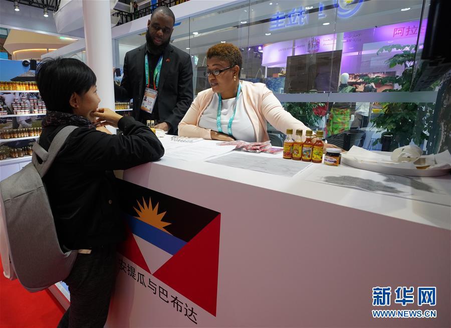 11月8日,在加勒比地區(qū)國家展區(qū)安提瓜和巴布達(dá)展臺,一名參觀者(左)與工作人員交談。 中國國際進(jìn)口博覽會11月5日在上海開幕。國家貿(mào)易投資綜合展(國家展)是中國國際進(jìn)口博覽會的重要內(nèi)容,共有82個國家、3個國際組織設(shè)立71個展臺。 新華社記者 程麗 攝