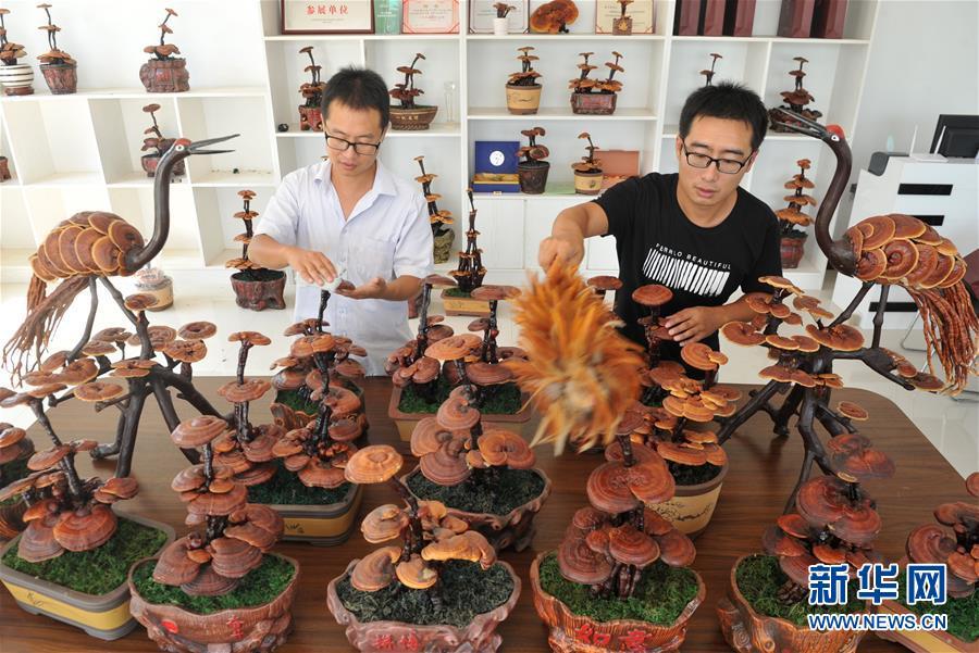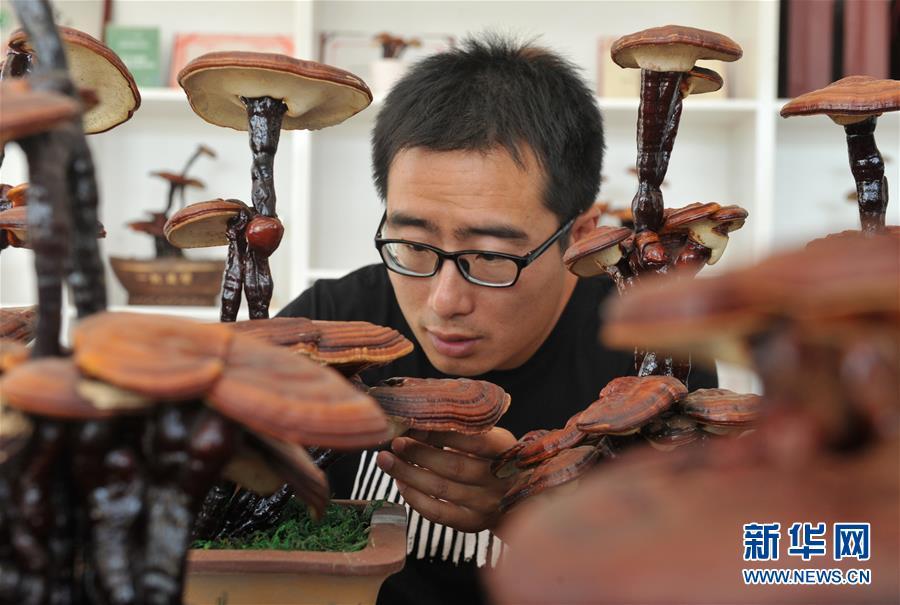 6月20日,廣宗縣大柏社村村民王志恒在展示制作的靈芝盆景。 近年來,河北省廣宗縣大柏社村積極引導農(nóng)民結(jié)合市場需求調(diào)整農(nóng)業(yè)產(chǎn)業(yè)結(jié)構(gòu),采取“公司+合作社+基地+農(nóng)戶”的經(jīng)營模式,發(fā)展特色靈芝種植,并開發(fā)出靈芝盆景、靈芝孢子粉等相關(guān)衍生產(chǎn)品,開辟出一條富農(nóng)創(chuàng)收新路徑。目前,大柏社村靈芝種植面積近百畝,種植各類靈芝5000余株,帶動120余名農(nóng)民就業(yè)增收。新華社記者朱旭東攝