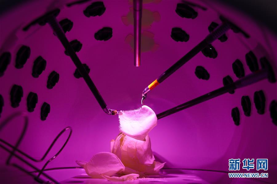 11月8日,在進(jìn)博會醫(yī)療器械及醫(yī)藥保健展區(qū),達(dá)芬奇Xi手術(shù)系統(tǒng)在演示切割花瓣。新華社記者 劉大偉 攝