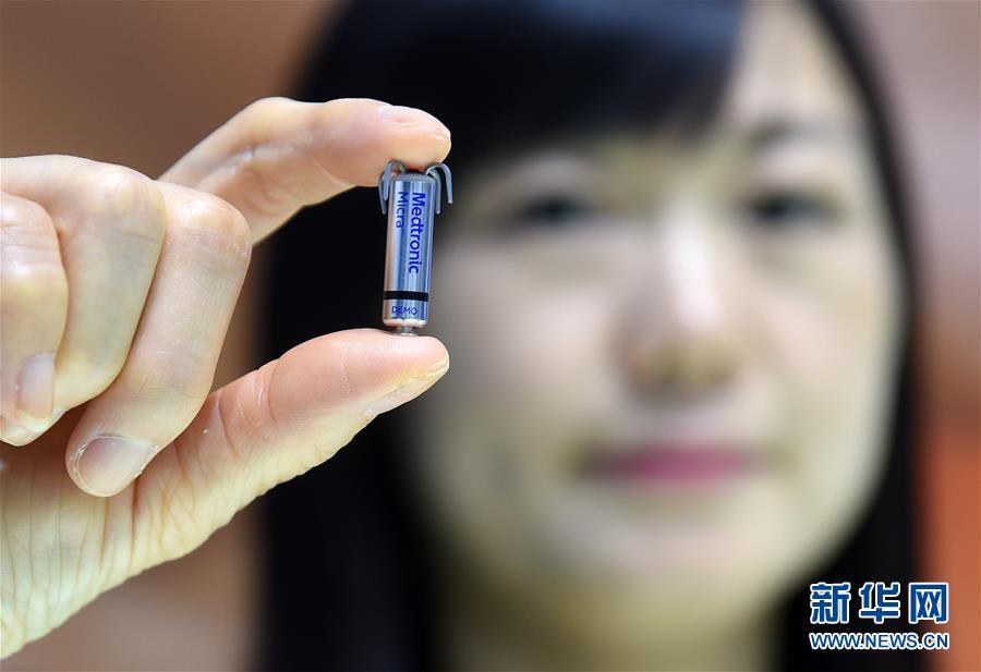 11月8日,在進(jìn)博會醫(yī)療器械及醫(yī)藥保健展區(qū)美敦力公司展臺,工作人員在展示全球最小的心臟起搏器。新華社記者 韓瑜慶 攝