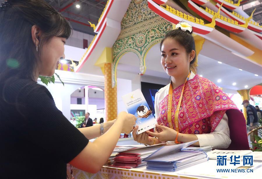 11月7日,在首屆中國國際進(jìn)口博覽會上,老撾展區(qū)工作人員(右)在向參觀者介紹情況。新華社記者 陳飛 攝