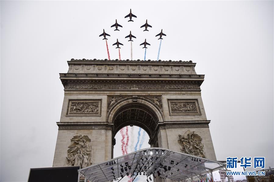 11月11日,在法國巴黎,“法蘭西巡邏兵”飛行表演隊(duì)在紀(jì)念儀式上飛過凱旋門。當(dāng)日,法國政府在巴黎凱旋門前舉行儀式,隆重紀(jì)念第一次世界大戰(zhàn)結(jié)束一百周年。新華社記者 陳益宸 攝