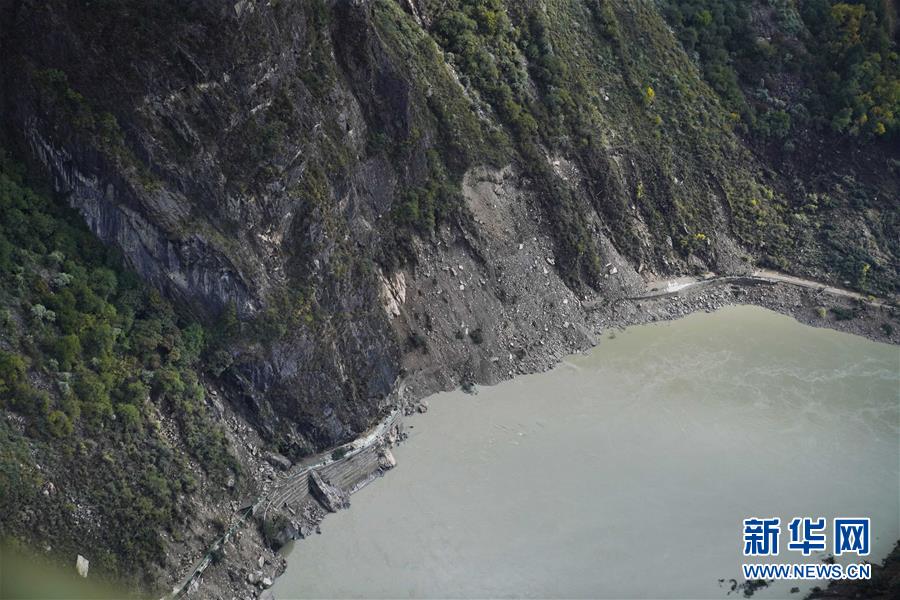 10月20日,西藏雅魯藏布江米林縣堰塞湖自然過(guò)流后,露出損毀的道路。 10月19日13時(shí)30分,西藏雅魯藏布江米林縣堰塞湖開始自然過(guò)流。記者從應(yīng)急管理部牽頭的聯(lián)合工作組獲悉,截至20日7時(shí),雅魯藏布江堰塞湖壩前水位已下降56米,估算留存水量1.6億立方米,堰塞湖洪水威脅得到緩解,防洪安全風(fēng)險(xiǎn)大大減輕,并將繼續(xù)降低。 10月20日,記者乘坐直升機(jī)從空中拍攝了雅魯藏布江堰塞湖自然過(guò)流的畫面。 新華社記者普布扎西攝