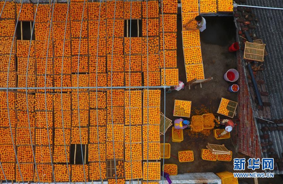 10月17日,廣西桂林市平樂縣沙子鎮(zhèn)渡河村農(nóng)民在晾曬柿子(無人機(jī)拍攝)。 金秋時(shí)節(jié),農(nóng)民們忙著收獲成熟的農(nóng)作物,喜迎豐收。 新華社記者 黃孝邦 攝