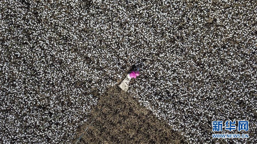 陳喜波的表嫂宋仙在新疆巴楚縣多來提巴格鄉(xiāng)卡扎尼塔皮提村的棉田中拾花(10月25日無人機拍攝)。