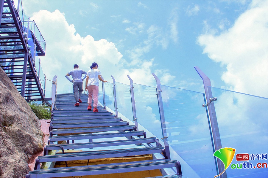 2018年8月,廣東清遠(yuǎn)。如今,玻璃橋、玻璃觀景臺、玻璃漂流道、玻璃滑道等玻璃產(chǎn)品可以說多如牛毛,琳瑯滿目。這些玻璃產(chǎn)品都是水平的,即使有坡度,也是借助工具滑下去的。小伙伴們是否挑戰(zhàn)體驗過像樓梯一樣的玻璃天梯,階梯式攀向高處,直聳云宵,云霧飄渺。