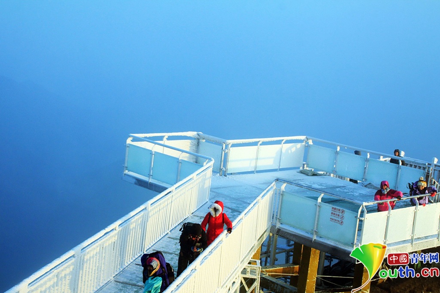 上到金子山最高峰可以看到,玻璃天梯像一條巨龍,沿著金子山最高峰山腰蜿蜒而上,每一個階梯都是玻璃做的,頂上是藍(lán)天白云,四周是莽莽群山,天梯下面是深不可測的懸崖絕壁?!?br/>