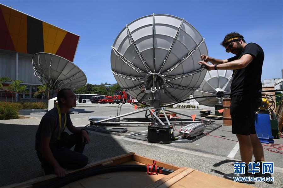 11月13日,工作人員在巴布亞新幾內亞首都莫爾茲比港的APEC國際媒體中心安裝衛(wèi)星設備。 新華社記者呂小煒攝