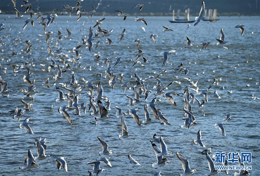 這是11月14日拍攝的在昆明滇池上飛翔的紅嘴鷗。 新華社記者 藺以光 攝