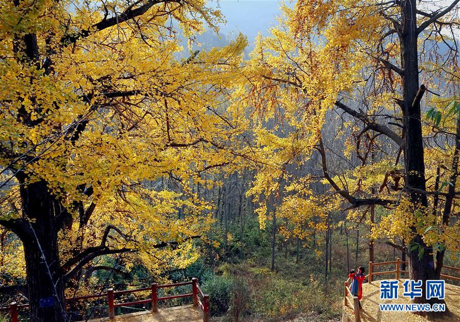 11月1日,游客在河南省嵩縣白河鄉(xiāng)下寺村古銀杏樹下拍攝秋景。 深秋時節(jié),河南省嵩縣白河鄉(xiāng)下寺村的古銀杏林為小山村披上了“金甲”。漫天黃葉,遍地金色,一幢幢民居掩映在色彩斑斕的世界里,美不勝收,吸引了眾多游客賞景拍照。 新華社記者 李安 攝