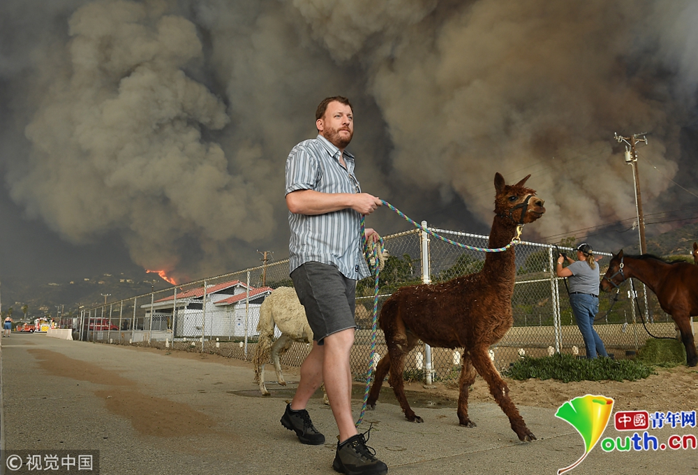 當?shù)貢r間2018年11月10日,美國加州Paradise,當?shù)厣交鹚僚?,?zāi)區(qū)民眾紛紛帶領(lǐng)家畜進行轉(zhuǎn)移。自本周三開始,加州多地發(fā)生山火,火勢蔓延迅猛,數(shù)萬人被迫撤離,數(shù)以萬計的房屋被燒毀。圖片作者:Jessica Christian