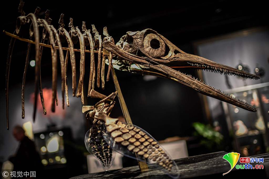 當?shù)貢r間2018年11月19日,法國巴黎,在展出中的1.8億年前侏羅紀時期的恐龍骨架,將于11月20日在Drouot拍賣行拍賣。圖片來源:視覺中國