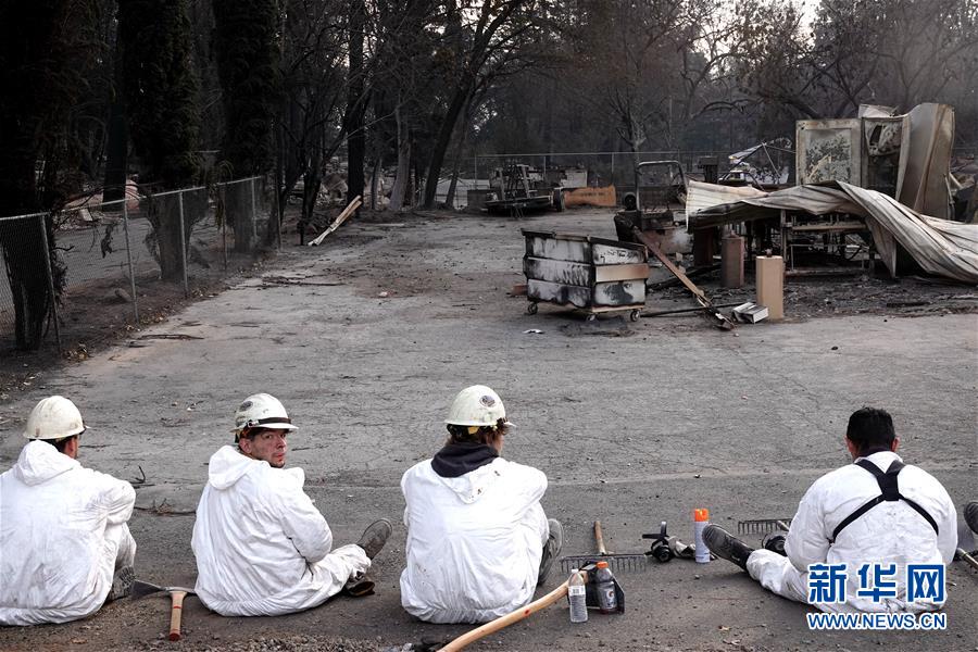 11月20日,在美國加利福尼亞州比尤特縣天堂鎮(zhèn),救援人員在山火廢墟中工作。