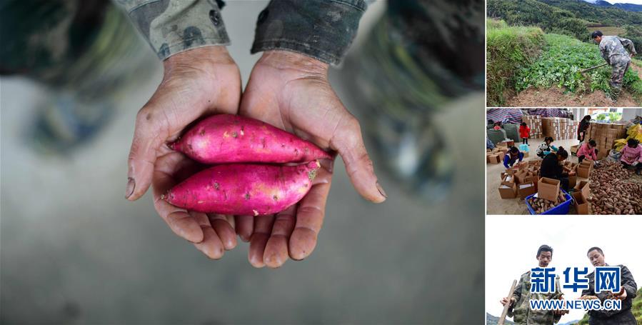 拼版照片:左圖為在大浪鎮(zhèn)桐里村,55歲的韋炳莊手捧剛剛收獲的高山紅薯;右上圖為韋炳莊在地里挖紅薯;右中圖為在縣城一個電商基地里,工作人員打包貧困戶種植的紅薯,準(zhǔn)備發(fā)往全國各地;右下圖為韋炳莊(左)在地里挖紅薯(照片均攝于11月18日)。今年,韋炳莊種植3畝高山紅薯,每畝年產(chǎn)3000多斤,他家已于2016年實(shí)現(xiàn)脫貧。 廣西融水苗族自治縣是國家扶貧工作重點(diǎn)縣,全縣“九山半水半分田”,生活生產(chǎn)環(huán)境較為惡劣,脫貧攻堅(jiān)任務(wù)艱巨,目前還有7.68萬貧困人口。面對經(jīng)濟(jì)發(fā)展落后、貧困面廣且程度深的現(xiàn)狀,當(dāng)?shù)匕衙撠毠?jiān)與創(chuàng)新產(chǎn)業(yè)扶持相結(jié)合,依托生態(tài)資源優(yōu)勢,實(shí)施“特色產(chǎn)業(yè)富民行動”,通過發(fā)展特色民族旅游、林下經(jīng)濟(jì)和特色養(yǎng)殖業(yè)等扶貧產(chǎn)業(yè),帶動貧困群眾依靠勤勞的雙手,拔窮根摘窮帽,實(shí)現(xiàn)脫貧致富。據(jù)了解,目前全縣貧困戶參與特色產(chǎn)業(yè)發(fā)展的有2.9萬戶,扶貧產(chǎn)業(yè)覆蓋率達(dá)95%。 新華社記者 黃孝邦 攝
