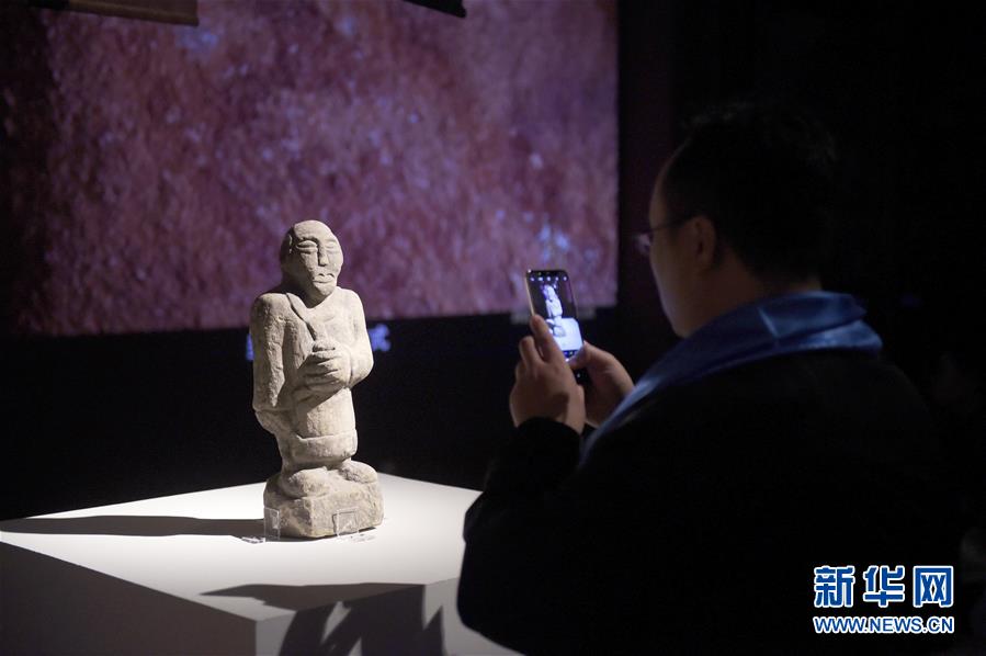 11月21日,觀眾在中國美術(shù)館拍攝展出作品“唐石人像”。新華社記者 魯鵬 攝