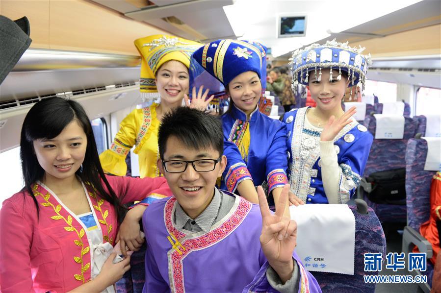 在廣西南寧站,身著民族服裝的乘客搭乘動車準備出行(2013年12月30日攝)。 廣西壯族自治區(qū)成立60年來,鐵路建設(shè)發(fā)生翻天覆地的變化。來自中國鐵路南寧局集團有限公司的數(shù)據(jù)顯示,1958年廣西鐵路總里程為1346.3公里,如今廣西鐵路總里程達5191公里。廣西與周邊相鄰省份間實現(xiàn)動車“公交化”開行。此外,北部灣港—重慶班列、東盟海產(chǎn)品冷鏈班列、“百色一號”果蔬專列等的開通和運營,強化了鐵路供給的針對性和有效性。鐵路成為助推廣西經(jīng)濟社會快速發(fā)展的“大動脈”。 新華社記者周華攝