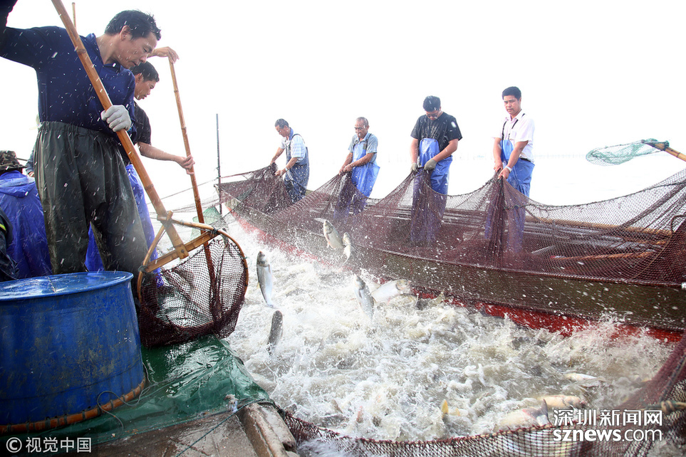 2018年6月26日,江蘇省常州市嘉澤鎮(zhèn)捕撈村的漁民組織夏季捕撈,一網(wǎng)魚達五萬余斤,以鰱魚為主,供應市場需求。夏捕的魚價較平時有所上漲,漁民粗略估計可增收上萬余元。