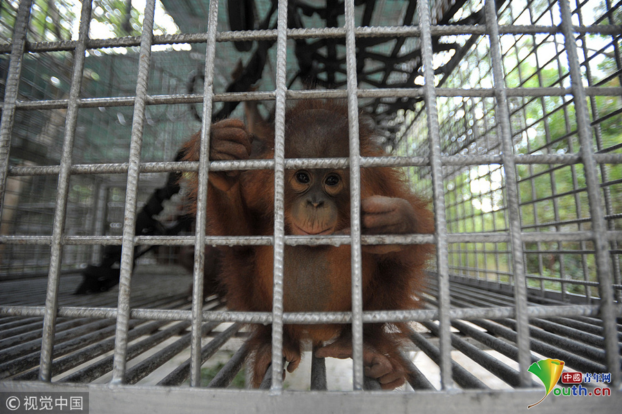 當(dāng)?shù)貢r(shí)間2018年9月18日,印尼加里曼丹克塔邦,國際動(dòng)物救援(IAR)猩猩安全與保護(hù)中心里,飼養(yǎng)員用獨(dú)輪車把猩猩寶寶送到森林學(xué)校。圖片作者:Newscom