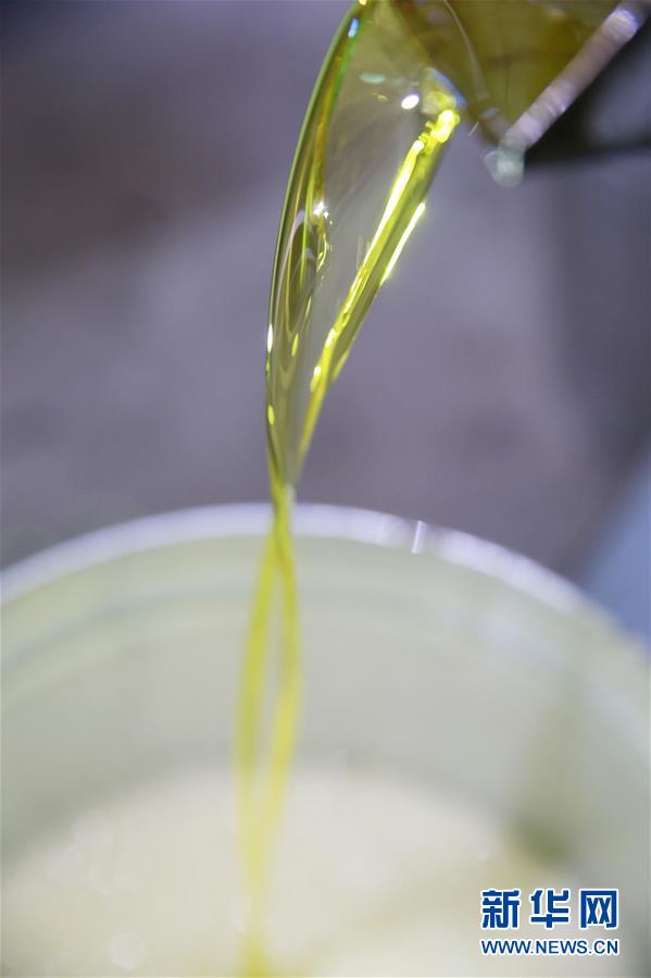 11月22日,在廣西柳州三江侗族自治縣斗江鎮(zhèn)一茶油加工點,新榨的茶油從榨油機(jī)流出。新華社記者任正來攝