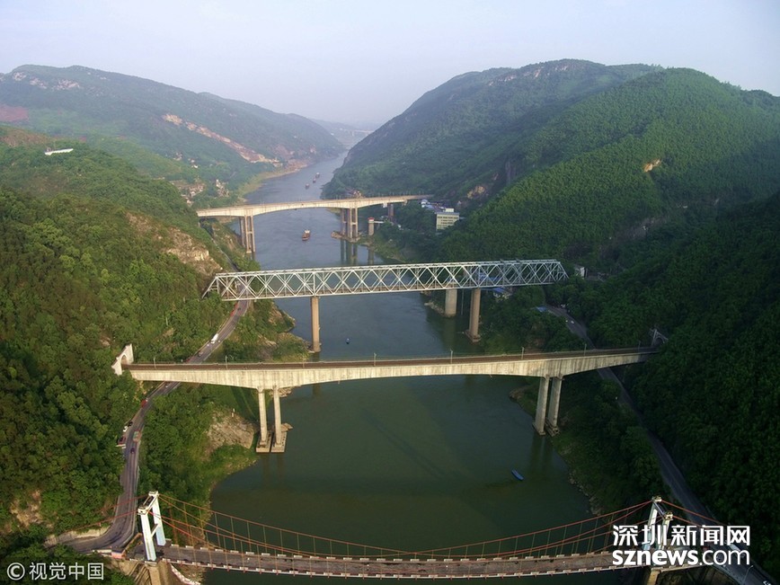 畫面中由近及遠(yuǎn)分別是新朝陽橋、老朝陽橋、遂渝鐵路橋、襄渝鐵路橋、蘭渝鐵路橋。